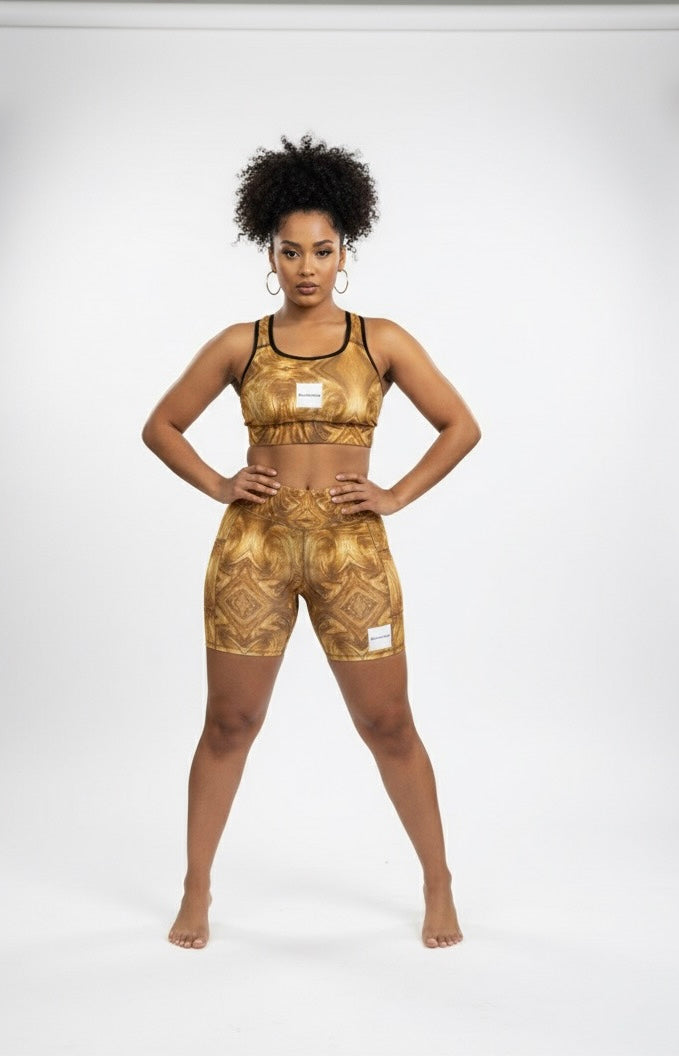 Get the Dripped In Gold Sports Bra, perfect for your workouts! This comfy bra has a soft moisture-wicking fabric, extra materials in shoulder straps, and removable padding for maximum support.